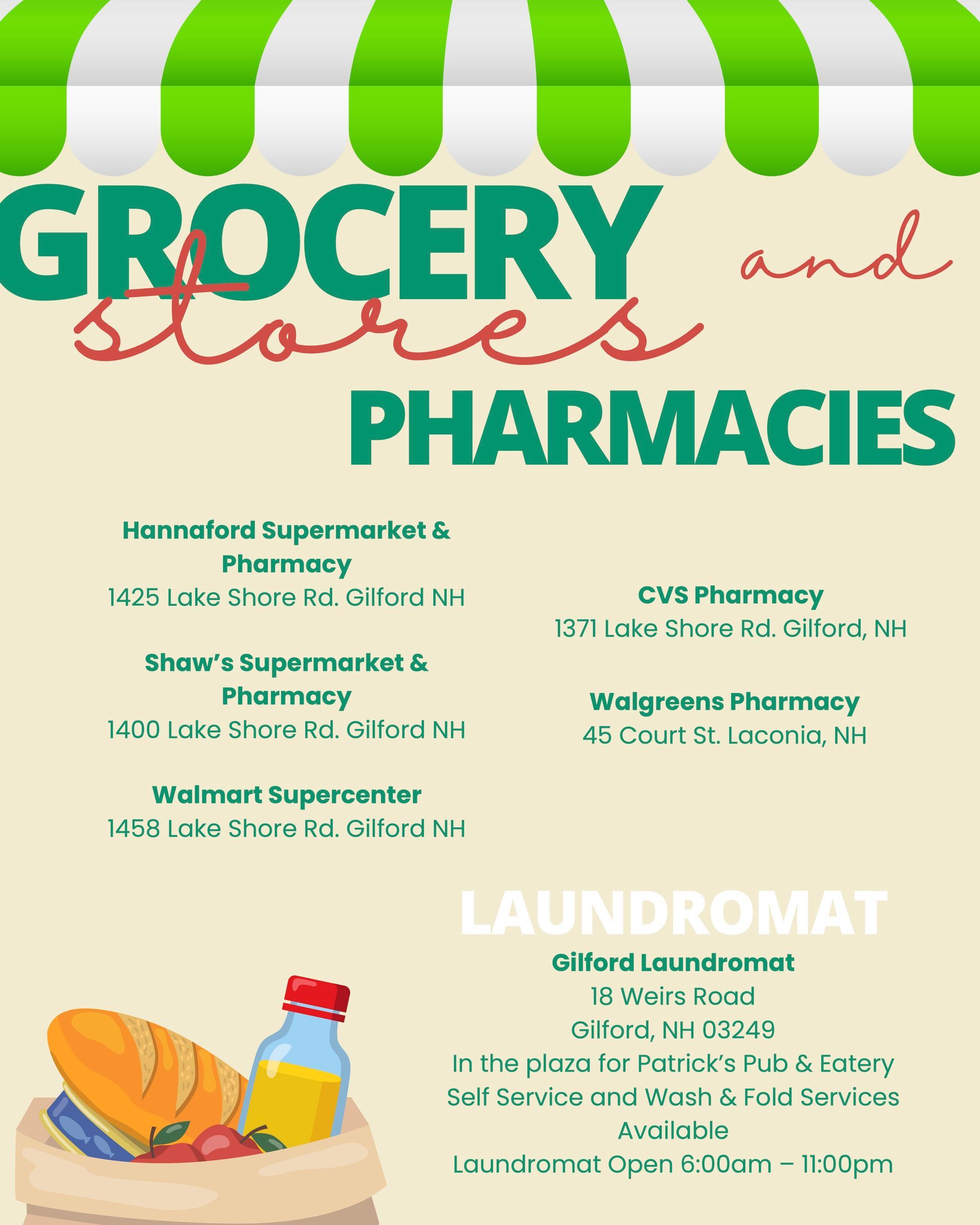 - Grocery Store, Pharmacies, and Laundromat